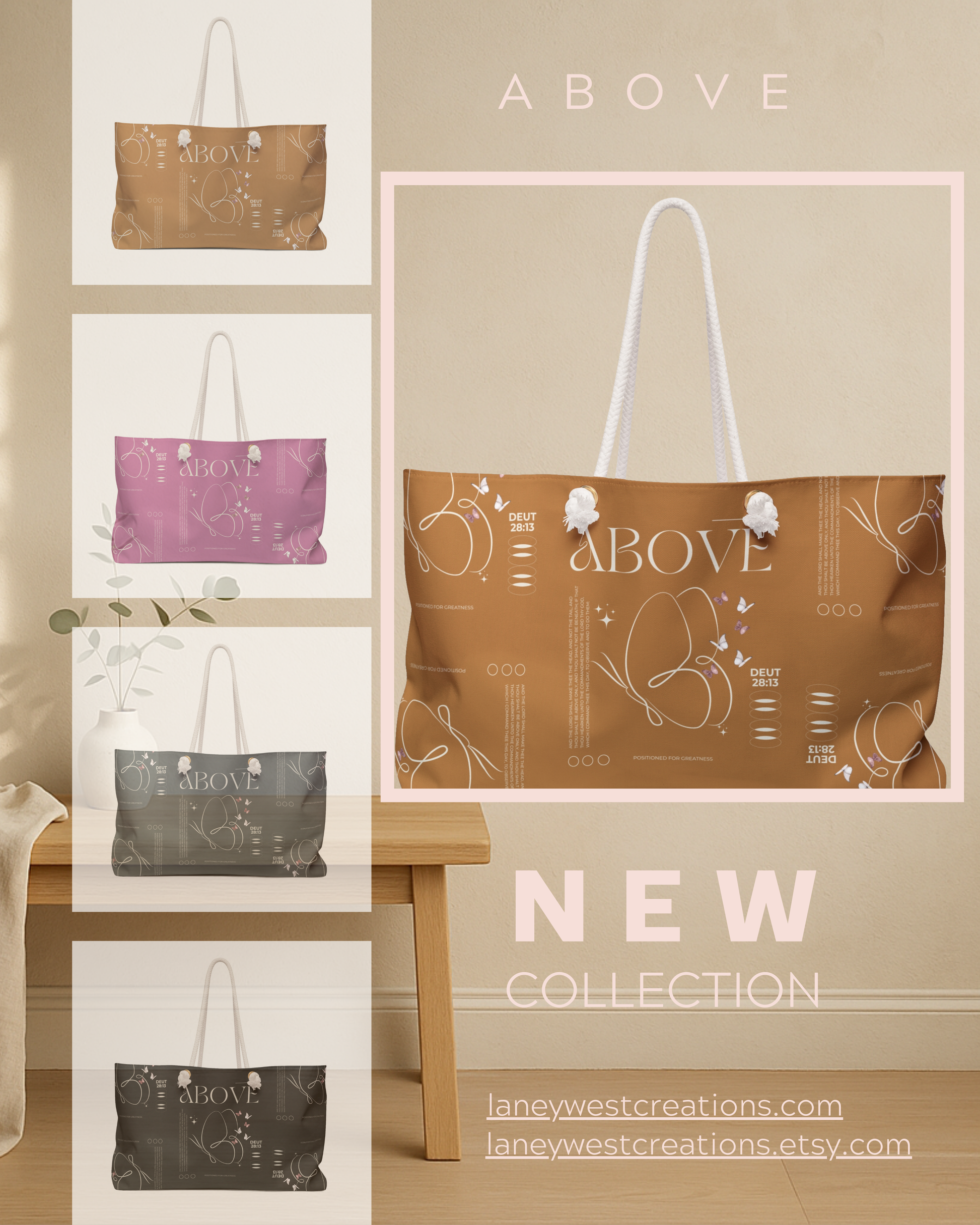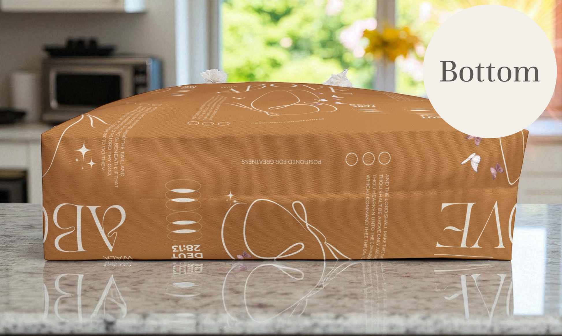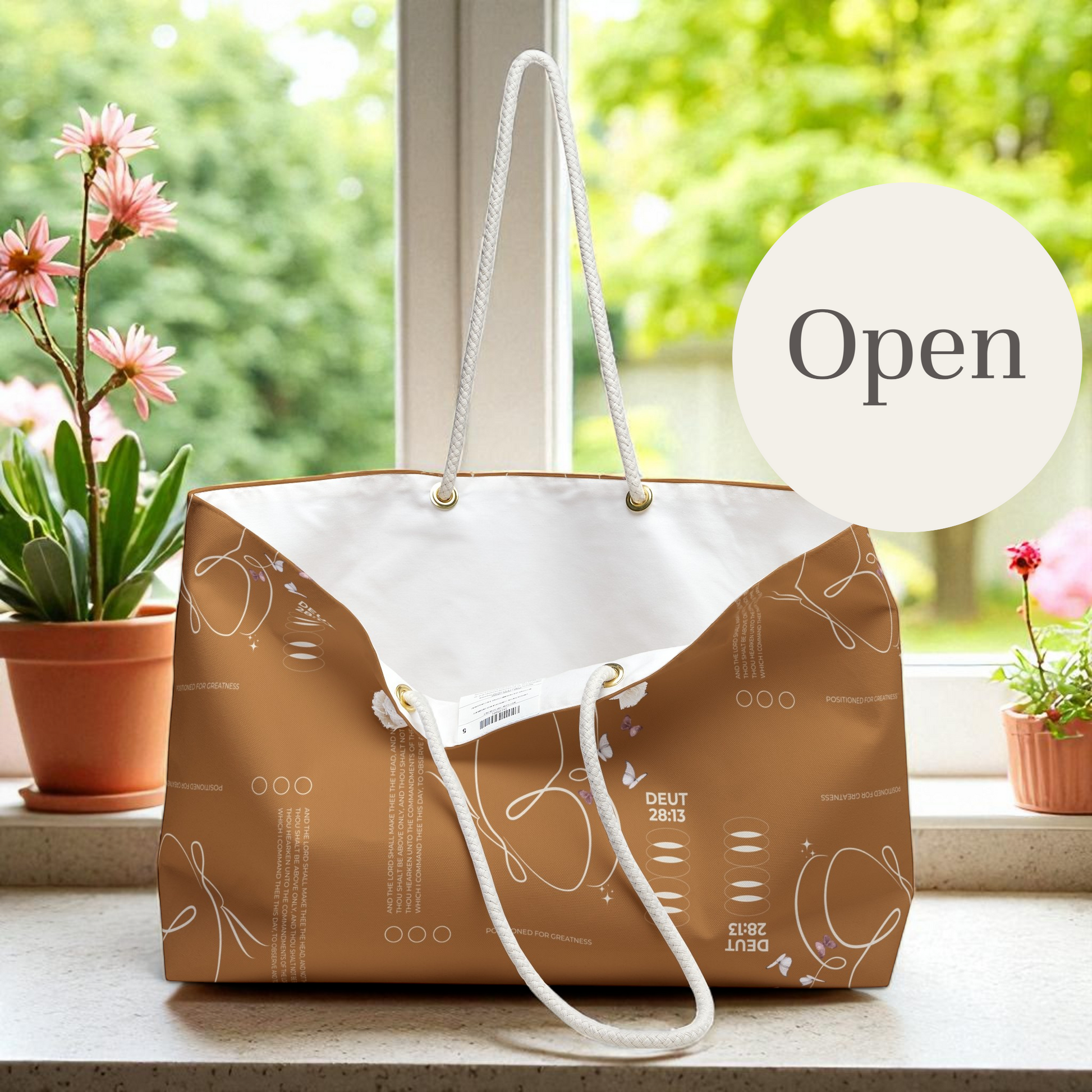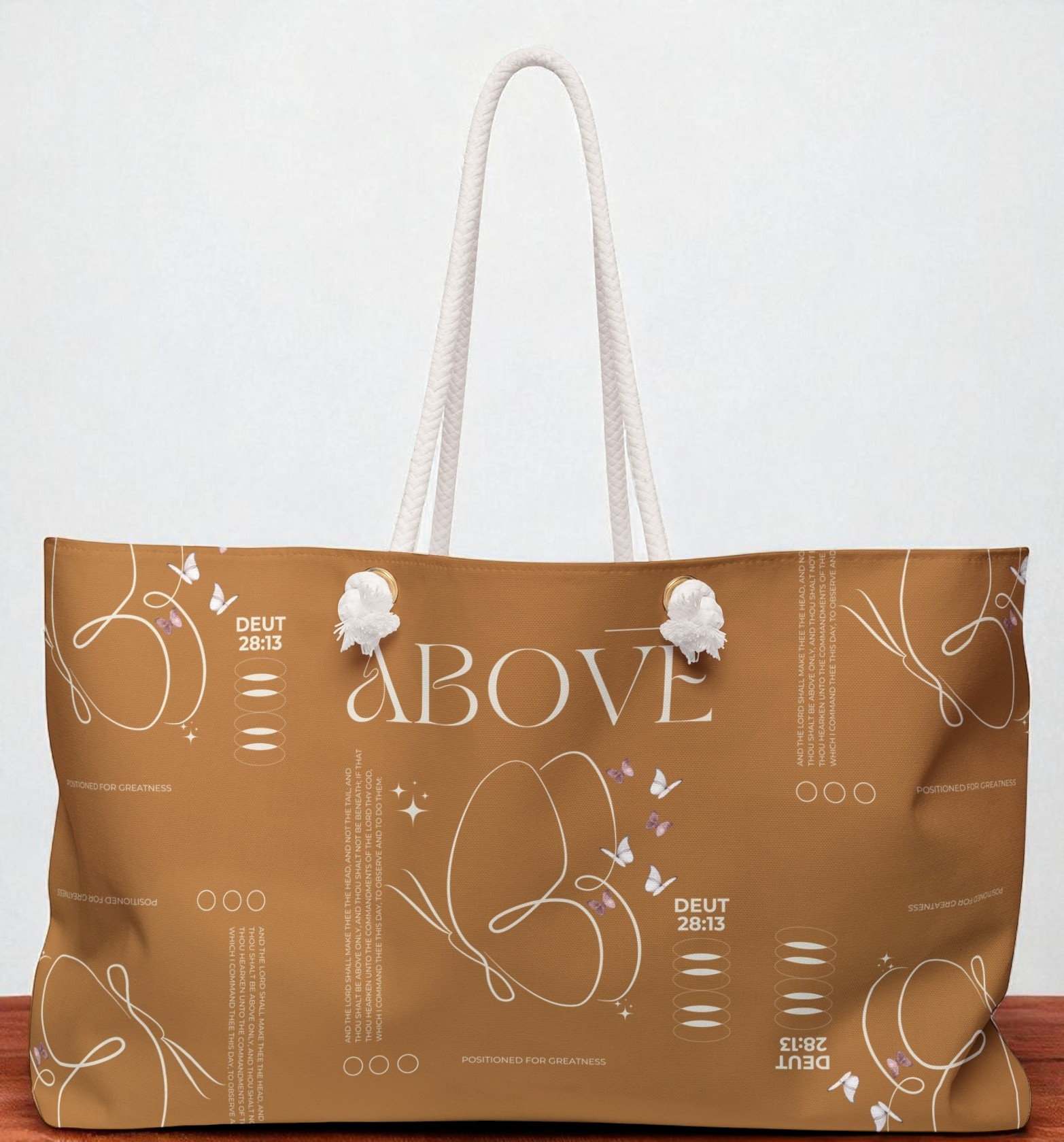 A warm take on the everyday carry—sleek, roomy, and light on the shoulder. The rich cocoa tone plays well with neutrals year-round, and the butterfly line art keeps it fresh. A subtle note on the print—walk above, not beneath (Deut. 28:13)—adds quiet confidence.
