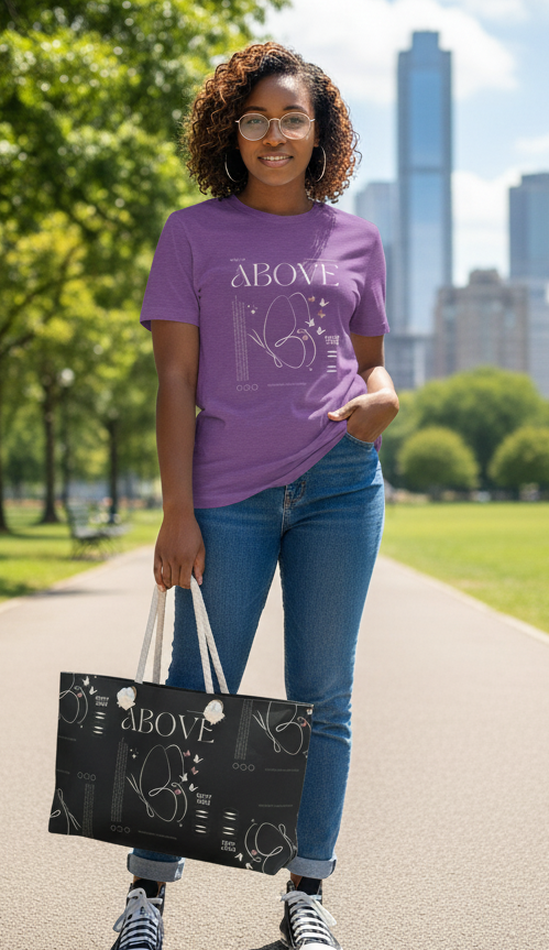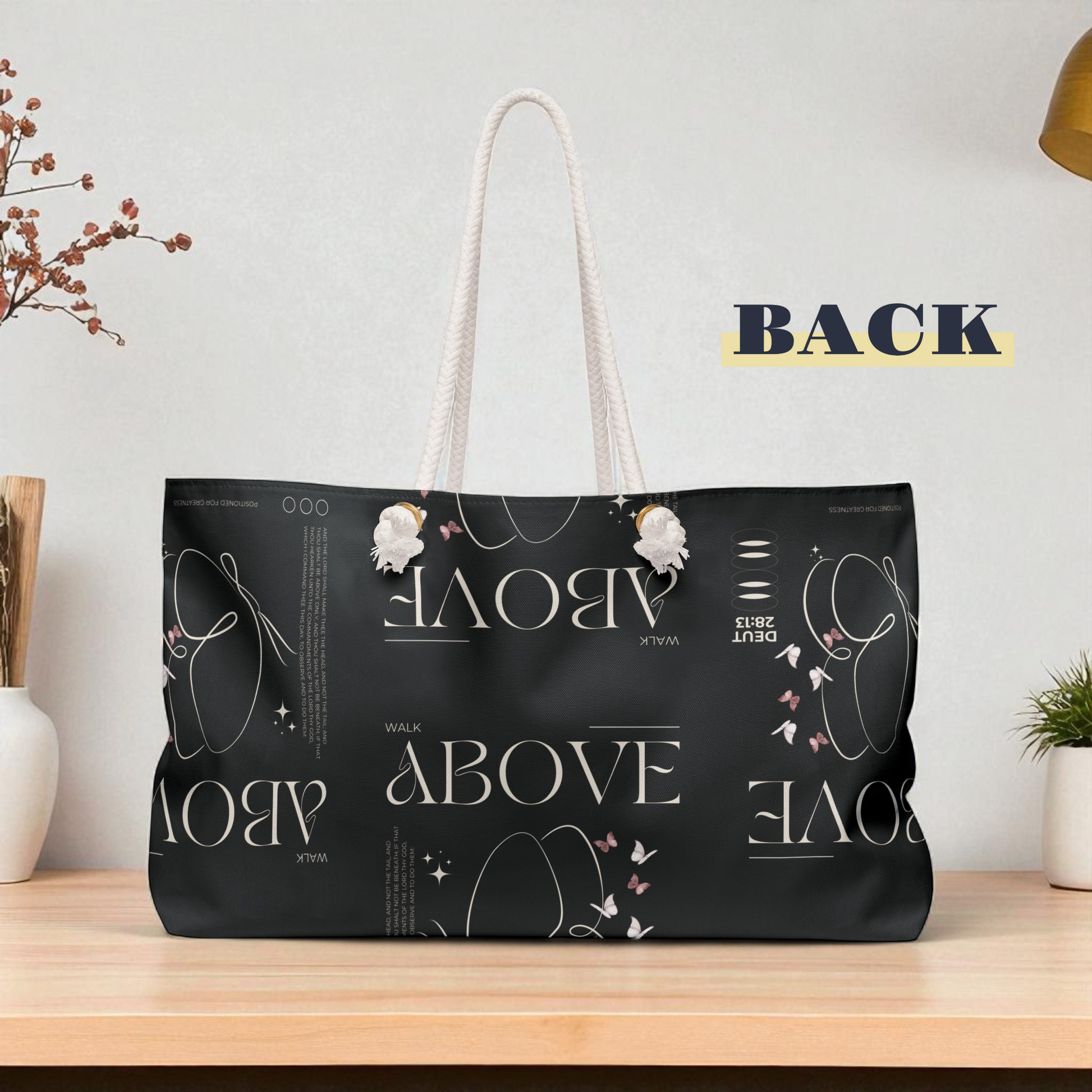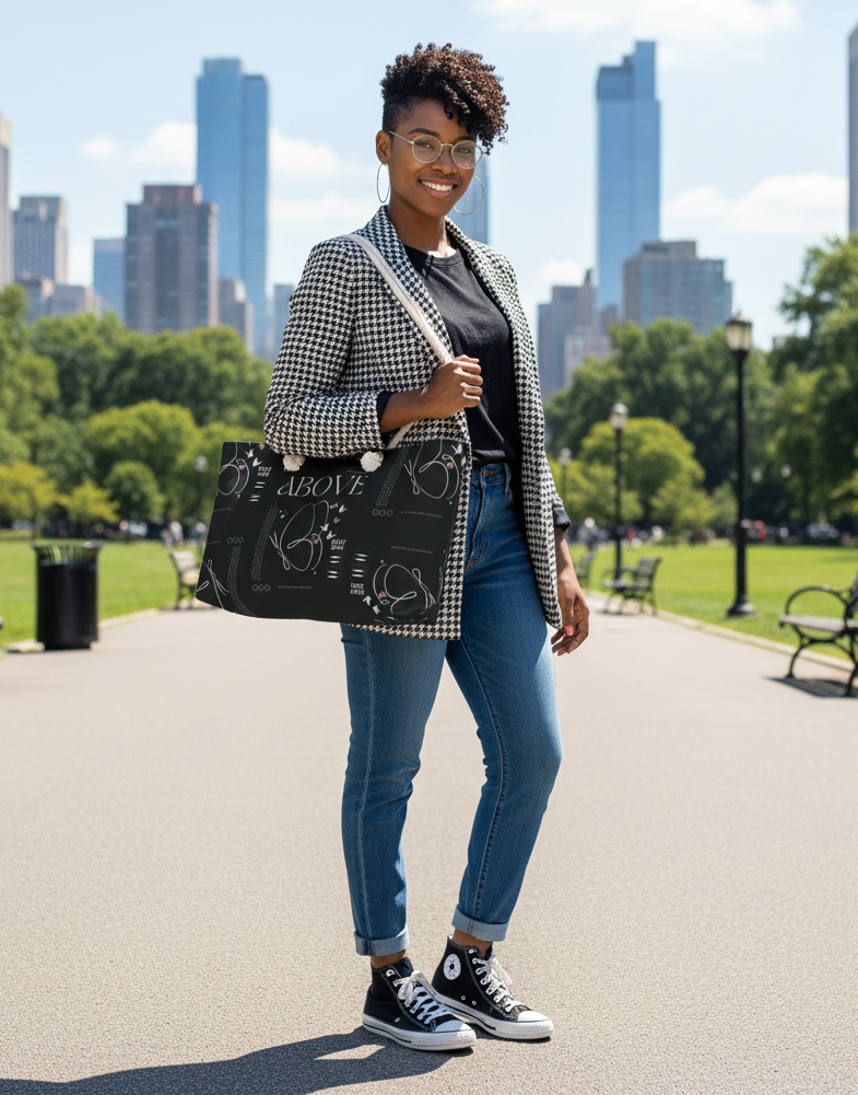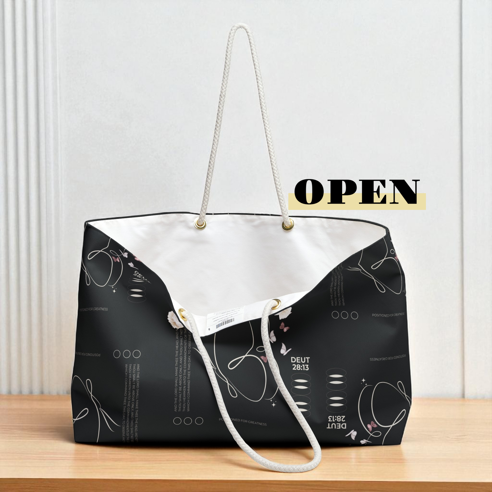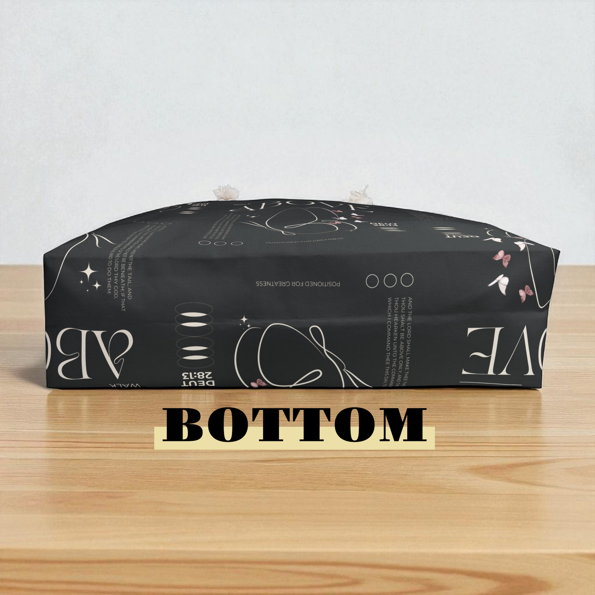 Sleek and oversized without the fuss, this is the tote that moves how you move—office, airport, coffee line, late plans. The butterfly line art keeps it fresh, and the subtle note on the print — walk above, not beneath (Deut. 28:13) — adds quiet confidence and a reminder to move with purpose.